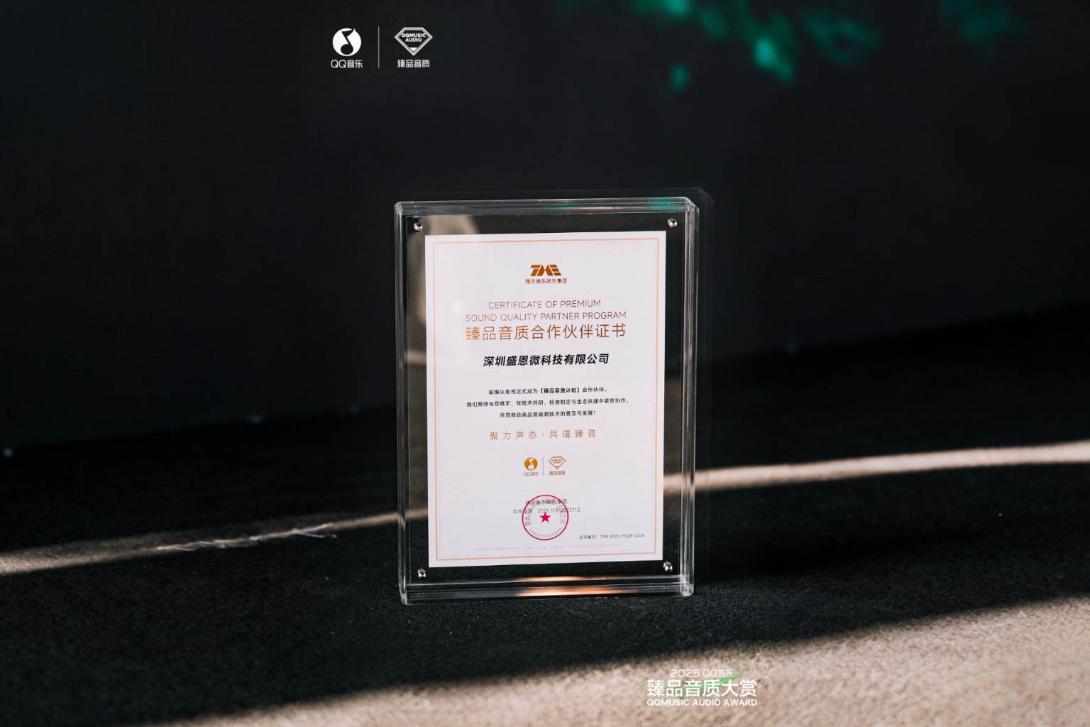 推出LHDC高清音频编解码技术的盛微先进科技加入了“臻品音质合作伙伴计划”,在大赏的「臻品音质」计划合作伙伴授牌仪式上,获得由QQ音乐颁发的「臻品音质合作伙伴证书」。活动现场展示了多款支持LHDC高清音频编解码的产品,观众可以在现场体验。